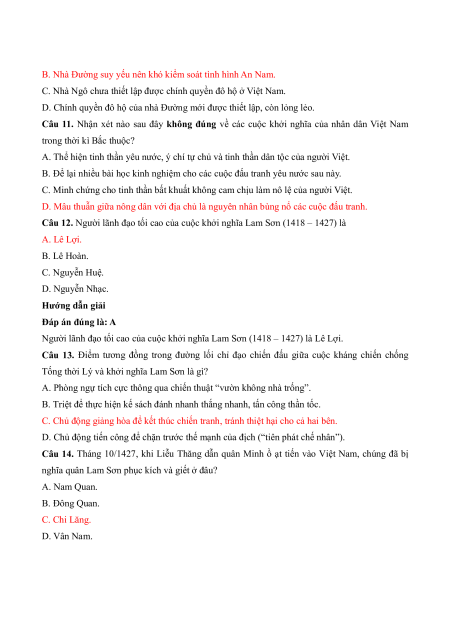 Câu 11. Nhận xét nào sau đây không đúng về các cuộc khởi nghĩa của nhân dân Việt Nam