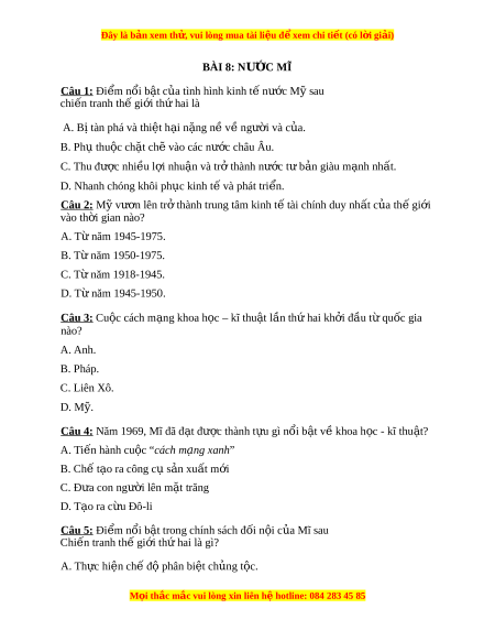 Đây là bản xem th , vu ử i lòng mua tài li u ệ đ xe ể m chi ti t (c ế ó l i ờ gi i ả ) BÀI 8: NƯ C Ớ MĨ Câu 1: Đi m ể nổi b t ậ c a ủ tình hình kinh t n ế ư c M ớ ỹ sau chi n t ế ranh th gi ế i ớ th hai ứ là A. Bị tàn phá và thi t ệ h i ạ n ng n ặ v ề ề ngư i ờ và c a. ủ B. Ph t ụ hu c ch ộ t ặ ch vào các n ẽ ư c ớ châu Âu. C. Thu đư c nhi ợ u l ề i ợ nhu n ậ và tr t ở hành nư c ớ t b ư n gi ả àu m nh ạ nh t ấ . D. Nhanh chóng khôi ph c