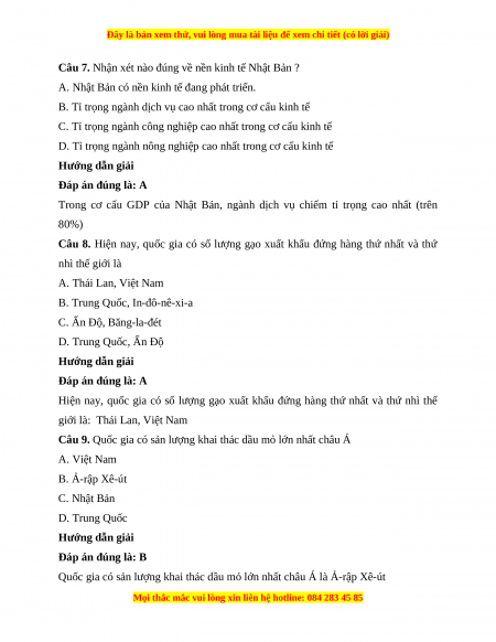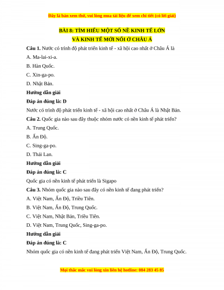 Câu 1. Nước có trình độ phát triển kinh tế - xã hội cao nhất ở Châu Á là A. Ma-lai-xi-a. B. Hàn Quốc. C. Xin-ga-po. D. Nhật Bản. Hướng dẫn giải Đáp án đúng là: D