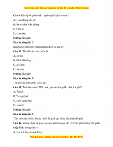 Câu 9. Hàn Quốc phát triển mạnh ngành dịch vụ nào? A. Giao thông vận tải. B. Bưu chính viễn thông. C. Giải trí D. Giáo dục Hướng dẫn giải Đáp án đúng là: C
