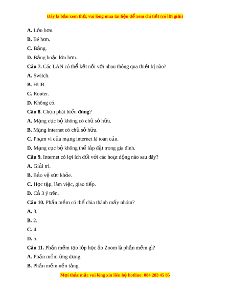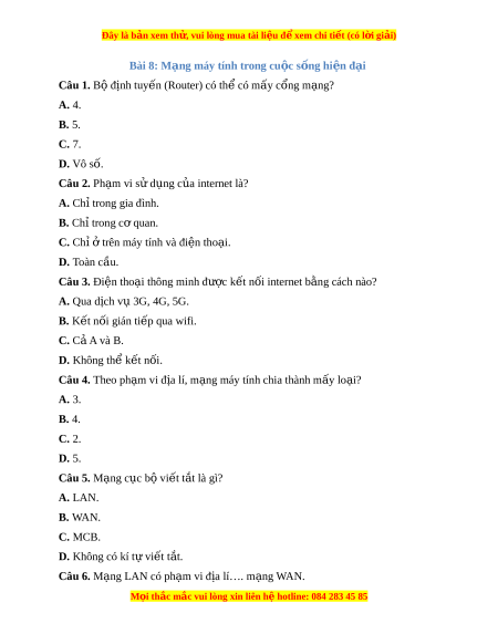 C. Chỉ ở trên máy tính và đi n t ệ ho i ạ . D. Toàn cầu. Câu 3. Đi n t ệ ho i ạ thông minh đư c ợ k t ế n i ố internet b ng ằ cách nào? A. Qua d ch v ị ụ 3G, 4G, 5G. B. K t ế nối gián ti p ế qua wifi. C. C ả A và B. D. Không th k ể t ế n i ố . Câu 4. Theo ph m ạ vi đ a l ị í, m ng m ạ áy tính chia thành m y l ấ o i ạ ? A. 3. B. 4. C. 2. D. 5. Câu 5. M ng c ạ c ụ b vi ộ t ế t t ắ là gì? A. LAN. B. WAN. C. MCB.
