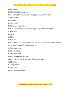 D. Không là phần m m ề gì c . ả Câu 12. Trong th c ự t , I ế oT có thể ng d ứ ng t ụ rong lĩnh v c ự nào? A. Smart home. B. Smart car. C. Smart watch D. T t ấ c các ả đáp án trên. Câu 13. L u t