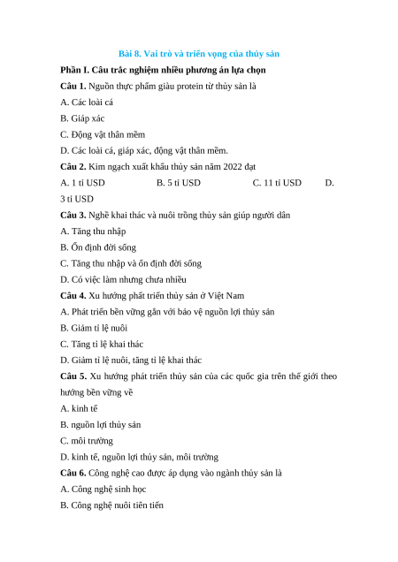Câu 5. Xu hướng phát triển thủy sản của các quốc gia trên thế giới theo hướng bền vững về A. kinh tế B. nguồn lợi thủy sản C. môi trường