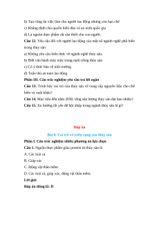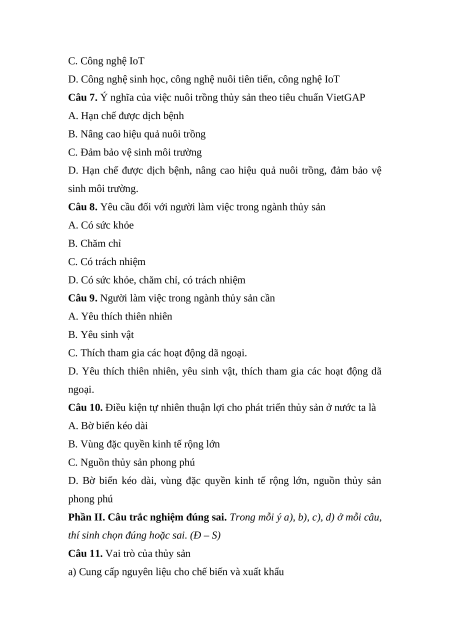 Câu 8. Yêu cầu đối với người làm việc trong ngành thủy sản A. Có sức khỏe B. Chăm chỉ C. Có trách nhiệm