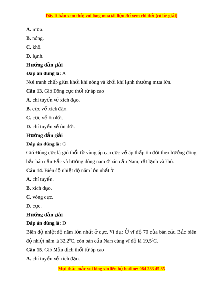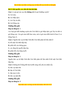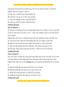 ự nào sau đây thư ng có m ờ a nhi ư u? ề A. N i ơ r ở t ấ sâu gi a l ữ c đ ụ a. ị B. Mi n có ề gió thổi theo mùa. C. N i ơ dòng bi n ể l nh đi ạ qua. D. Mi n ề có gió M u ậ d ch t ị h i ổ . Hư ng d ớ ẫn gi i ả Đáp án đúng là: B Vùng n m ằ sâu trong l c ụ đ a, ị n u ế không có gió t đ ừ i ạ dư ng ơ th i ổ vào thì m a ư r t ấ ít. Vùng có gió M u ậ d ch ị ho t ạ đ ng ộ sẽ ít m a, ư vùng có gió mùa ho t ạ đ ng ộ sẽ m a ư nhi u. ề Câu 12. N i ơ tranh ch p gi ấ a kh ữ i ố khí nóng và kh i ố khí l nh t ạ hư ng ờ M i