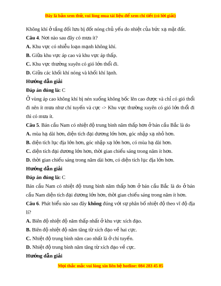 Đây là bản xem th , vu ử i lòng mua tài li u ệ đ xe ể m chi ti t (c ế ó l i ờ gi i ả ) Đáp án đúng là: D S phân b ự ố nhi t ệ đ t ộ heo vĩ đ đ ộ a l ị í là - Nhi t ệ đ ộ trung bình năm gi m ả t ừ xích đ o ạ v ề c c, ự nhi t ệ đ ộ trung bình năm cao nhất là chí ở tuy n. ế - Biên độ nhi t