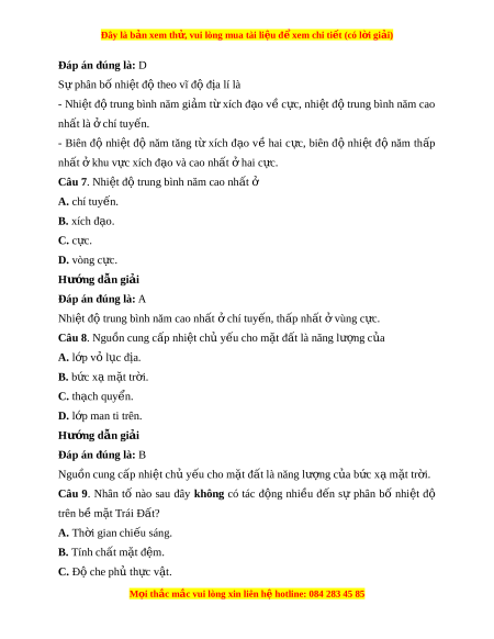 ệ độ năm tăng từ xích đ o ạ về hai c c, ự biên đ ộ nhi t ệ đ ộ năm th p ấ nhất khu v ở c ự xích đ o và cao ạ nh t ấ hai ở c c. ự Câu 7. Nhi t ệ đ t ộ rung bình năm cao nh t ấ ở A. chí tuy n. ế B. xích đ o. ạ C. c c. ự D. vòng c c. ự Hư ng d ớ ẫn gi i ả Đáp án đúng là: A Nhi t ệ đ t ộ rung bình năm cao nh t ấ chí ở tuy n, t ế h p nh ấ t ấ vùng c ở c. ự