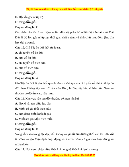 ạ gió nào sau đây không ph i ả là gió thư ng ờ xuyên? A. Gió mùa. B. Gió M u ậ d ch. ị C. Gió Tây ôn đ i ớ . D. Gió Đông c c. ự Hư ng d ớ ẫn gi i ả Đáp án đúng là: A Các lo i ạ gió th i ổ thư ng ờ xuyên trên Trái Đ t ấ là: gió M u ậ d ch, ị gió Tây ôn đ i ớ và gió Đông c c. ự Còn gió mùa th i ổ theo mùa, n i ơ có gió mùa đi n ể hình là Nam Á và Đông Nam Á. Câu 2. Nguồn b c x ứ ạ t M ừ t ặ Tr i ờ đ n ế Trái Đ t ấ phân b l ố n nh ớ t ấ ở A. b m ề t ặ Trái Đất h p t ấ h . ụ B. ph n h ả ồi vào không gian.