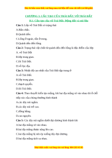 Đây là bản xem th , vu ử i lòng mua tài li u ệ đ xe ể m chi ti t ế (có l i ờ gi i ả ) CHƯ N Ơ G 3. CẤU TẠO C A Ủ TRÁI Đ T Ấ . V Ỏ TRÁI Đ T Ấ H .1. C u t ấ ạo c a v ủ ỏ Trái Đ t ấ . Đ ng đ ộ t ấ và núi l a ử Câu 1: L p v ớ ỏ Trái Đ t ấ có tr ng ạ thái A.R n ắ ch c. ắ B.Quánh d o. ẻ C.L ng ỏ ngoài ở , r n ắ ở trong. D.Quánh dẻo đ n l ế ng. ỏ Câu 2: Tr ng t ạ hái v t ậ chất t quánh d ừ o đ ẻ n l ế ng ỏ là đ c đi ặ m ể c a ủ l p ớ A. v ỏ Trái Đất B.l p t ớ rung gian. C.lõi Trái Đ t ấ . D.v l ỏ c đ ụ a. ị Câu 3: Nhi t ệ đ cao ộ nh t ấ c a ủ Trái Đ t ấ t p ậ trung ở A.v ỏ Trái Đ t ấ . B.l p t ớ rung gian. C.th ch ạ quy n. ể D.lõi Trái Đất. Câu 4: Theo thuy t ế ki n t ế o m ạ ng, ả khi hai đ a m ị ng xô vào nhau ả thì ch ở ỗ ti p xúc c ế a chúng ủ thư ng hì ờ nh thành A.các dãy núi ngầm. B.các dãy núi tr cao. ẻ C.đồng b ng. ằ D.cao nguyên.