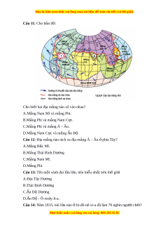 Đây là bản xem th , vu ử i lòng mua tài li u ệ đ xe ể m chi ti t ế (có l i ờ gi i ả ) Câu 11: Cho b n ả đồ: Cho bi t ế hai địa m ng ả nào xô vào nhau? A.M ng ả Nam Mĩ và m ng Phi ả . B.M ng Phi ả và m ng ả Nam C c. ự C.M ng Phi ả và m ng ả Á – Âu. D.M ng ả Nam C c ự và m ng ả n Đ Ấ . ộ Câu 12: Địa m ng ả nào tách xa đ a m ị ng ả Á – Âu phí ở a Tây? A.M ng ả B c ắ Mĩ. B.M ng ả Thái Bình Dư ng ơ C.M ng N ả am Mĩ. D.M ng ả Phi. Câu 13: Tên m t ộ vành đai l a ử l n, t ớ iêu bi u nh ể t ấ trên th gi ế i ớ A.Đ i ạ Tây Dư ng ơ B.Thái Bình Dư ng ơ C. n Đ Ấ ộ Dư ng ơ D. n Đ Ấ - ộ Ô-xtrây-li-a.