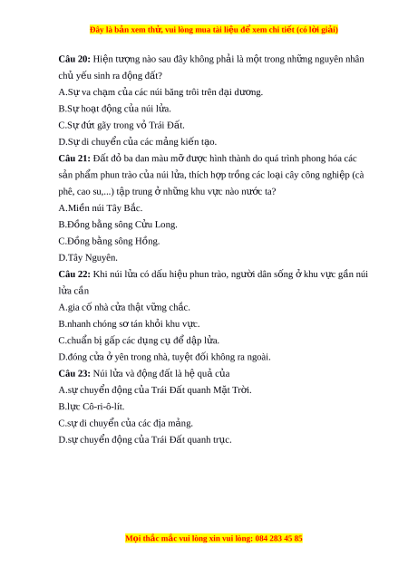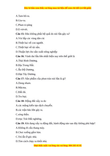Câu 16: Vành đai l a l ử n nh ớ t ấ hi n nay ệ trên th gi ế i ớ là A.Thái Bình Dư ng. ơ B.Địa Trung H i ả . C. n Đ Ấ ộ Dư ng. ơ D.Đ i ạ Tây Dư ng. ơ Câu 17: S n ả ph m ẩ c a ủ phun trào núi l a ử là gì? A.Dung nham. B.Măcma. C.Đất đá. D.Tro b i ụ . Câu 18: Đ ng ộ đ t ấ x y ả ra do A.các m ng ả ki n t ế o d ạ ch chuy ị n. ể B.các tr n ậ bão l n gây r ớ a. C.sóng th n. ầ D.tr c ụ Trái Đất nghiêng. Câu 19: Khi đang x y ả ra đ ng đ ộ t ấ , hành đ ng nào s ộ au đây không phù h p? ợ A.Không đi cầu thang máy. B.Chui xuống gầm bàn. C.Trú ẩn góc ở nhà. D.Tìm cách ch y r ạ a kh i ỏ nhà. M i