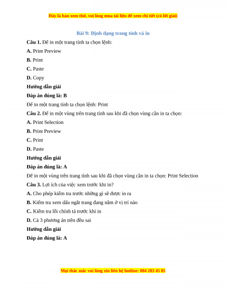 Câu 1. Để in một trang tính ta chọn lệnh: A. Print Preview B. Print C. Paste D. Copy Hướng dẫn giải