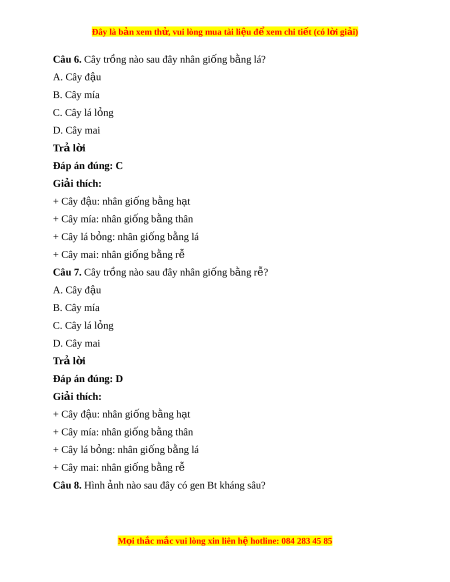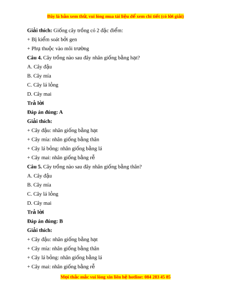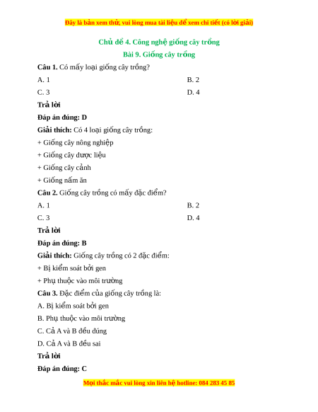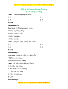 Đây là bản xem th , vu ử i lòng mua tài li u ệ đ xe ể m chi ti t (c ế ó l i ờ gi i ả ) Chủ đ 4. C ề ông ngh gi ệ ng cây t ố r ng ồ Bài 9. Gi ng ố cây tr ng ồ Câu 1. Có mấy lo i ạ giống cây tr ng? ồ A. 1 B. 2 C. 3 D. 4 Trả l i ờ Đáp án đúng: D
