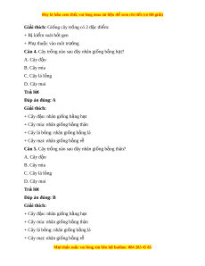 Giải thích: Giống cây trồng có 2 đ c ặ đi m ể : + Bị ki m ể soát b i ở gen + Ph t ụ hu c ộ vào môi trư ng ờ Câu 3. Đặc đi m ể c a ủ giống cây trồng là: A. Bị ki m ể soát b i ở gen B. Ph t ụ hu c vào m ộ ôi trư ng ờ C. Cả A và B đ u đúng ề D. C ả A và B đ u s ề ai Trả l i ờ Đáp án đúng: C M i