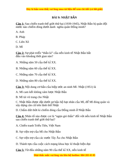 Đây là bản xem th , vu ử i lòng mua tài li u ệ đ xe ể m chi ti t (c ế ó l i ờ gi i ả ) BÀI 9: NHẬT BẢN Câu 1: Sau chi n ế tranh th gi ế i ớ th hai ứ (1939-1945), Nh t ậ B n ả b quân ị đ i ộ nư c nào ớ chi m ế đóng dư i