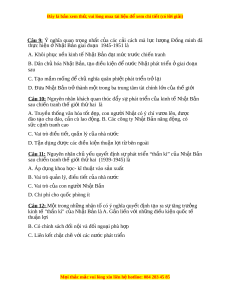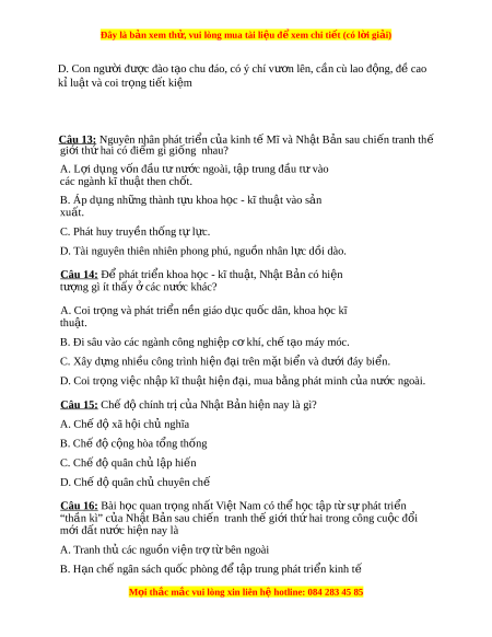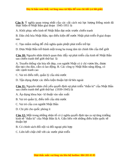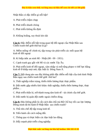 Đây là bản xem th , vu ử i lòng mua tài li u ệ đ xe ể m chi ti t (c ế ó l i ờ gi i ả ) Nh t ậ B n có đ ả ặc đi m ể gì nổi b t ậ ? A. Phát tri n ch ể m ậ ch p ạ B. Phát tri n nhanh chóng ể C. Phát tri n không ể n đ ổ nh ị D. Kh ng ủ ho ng, s ả uy thoái kéo dài Câu 6: Đặc đi m ể nổi b t ậ trong quan h đ ệ i ố ngo i ạ c a N ủ h t ậ B n s ả au Chi n t ế ranh th gi ế i ớ th hai ứ là gì? A. M m ề m ng ỏ v chí ề nh tr , t ị p
