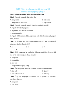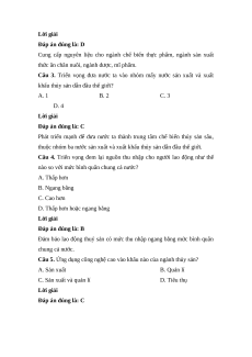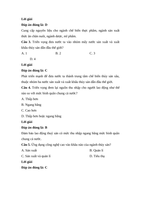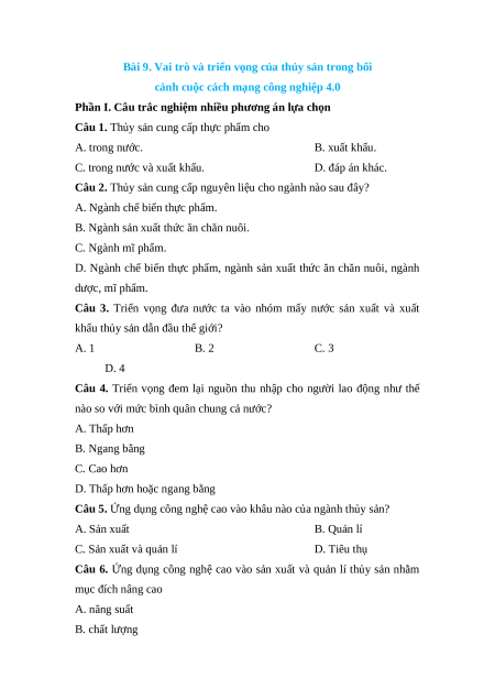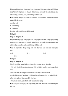 Câu 5. Ứng dụng công nghệ cao vào khâu nào của ngành thủy sản? A. Sản xuất B. Quản lí C. Sản xuất và quản lí D. Tiêu thụ