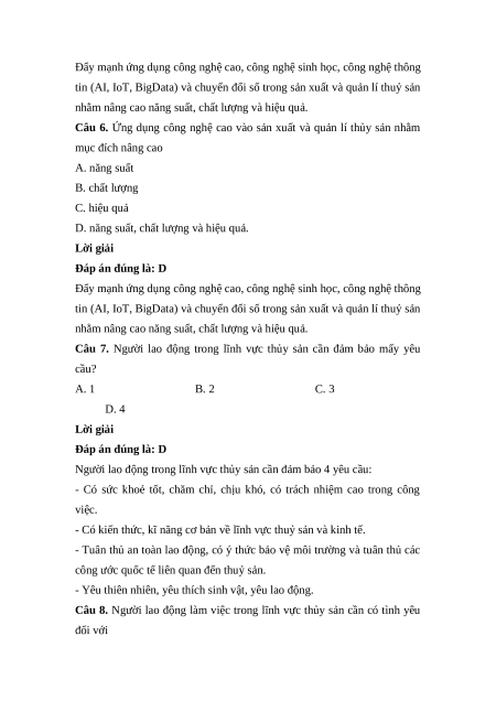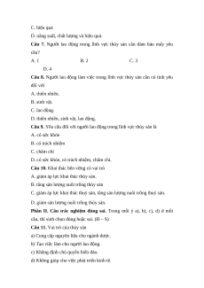 Câu 7. Người lao động trong lĩnh vực thủy sản cần đảm bảo mấy yêu cầu? A. 1 B. 2 C. 3 D. 4
