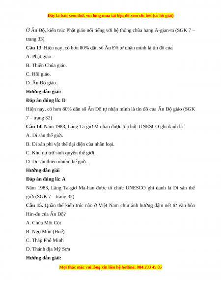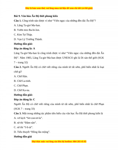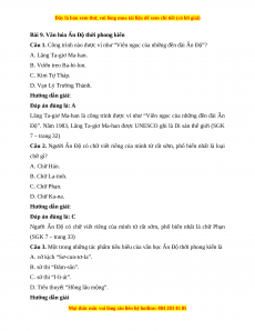 Câu 1. Công trình nào được ví như “Viên ngọc của những đền đài Ấn Độ”? A. Lăng Ta-giơ Ma-han. B. Vườn treo Ba-bi-lon. C. Kim Tự Tháp. D. Vạn Lý Trường Thành. Hướng dẫn giải: Đáp án đúng là: A