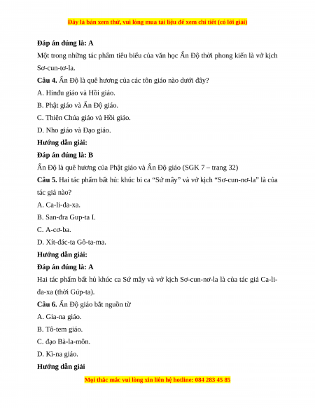 Câu 5. Hai tác phẩm bất hủ: khúc bi ca “Sứ mây” và vở kịch “Sơ-cun-nơ-la” là của tác giả nào? A. Ca-li-đa-xa. B. San-đra Gup-ta I. C. A-cơ-ba. D. Xít-đác-ta Gô-ta-ma. Hướng dẫn giải: Đáp án đúng là: A