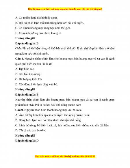 Câu 7. Châu Phi có khí hậu nóng và khô bậc nhất thế giới là do
