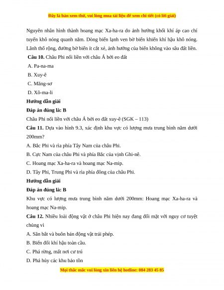 Câu 10. Châu Phi nối liền với châu Á bởi eo đất A. Pa-na-ma B. Xuy-ê C. Măng-sơ D. Xô-ma-li Hướng dẫn giải Đáp án đúng là: B