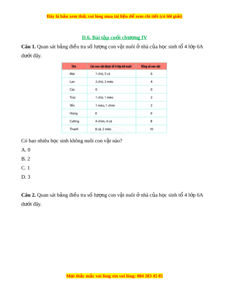 Đây là bản xem th , vu ử i lòng mua tài li u ệ đ xe ể m chi ti t (c ế ó l i ờ gi i ả ) D .6. B ài tập cu i ố chư ng I ơ V Câu 1. Quan sát b ng ả đi u t ề ra số lư ng con v ợ t ậ nuôi nhà c ở a h ủ c ọ sinh t 4 l ổ p 6A ớ dư i ớ đây. Có bao nhiêu h c s ọ inh không nuôi con v t ậ nào? A. 0 B. 2 C. 1 D. 3 Câu 2. Quan sát b ng ả đi u t ề ra số lư ng con v ợ t ậ nuôi nhà c ở a h ủ c ọ sinh t 4 l ổ p 6A ớ dư i ớ đây. M i ọ thắc m c