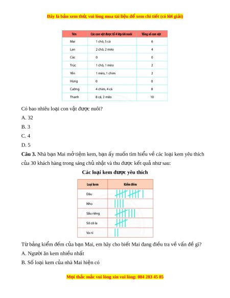 Đây là bản xem th , vu ử i lòng mua tài li u ệ đ xe ể m chi ti t (c ế ó l i ờ gi i ả ) Có bao nhiêu lo i ạ con v t ậ đư c nuôi ợ ? A. 32 B. 3 C. 4 D. 5 Câu 3. Nhà b n M ạ ai m t ở i m ệ kem, b n ạ y m ấ u n t ố ìm hi u v ể các ề lo i ạ kem yêu thích c a