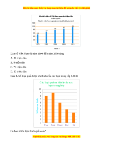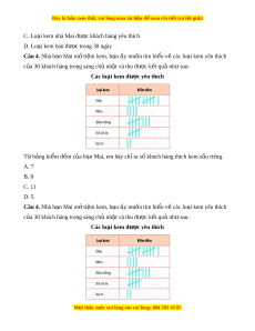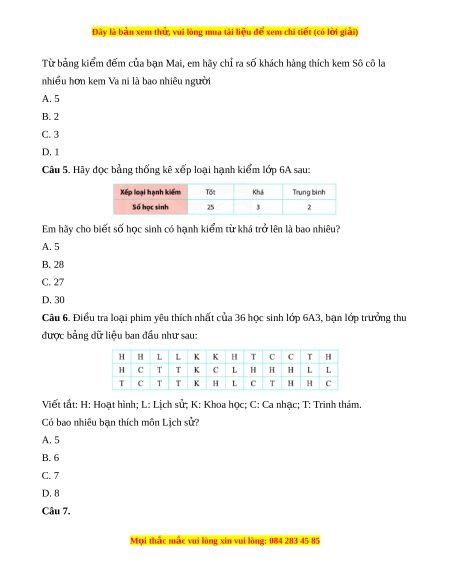 ơ kem Va ni là bao nhiêu ngư i ờ A. 5 B. 2 C. 3 D. 1 Câu 5. Hãy đ c b ọ ng t ả hống kê x p l ế o i ạ h nh ki ạ m ể l p 6A ớ sau: Em hãy cho bi t ế s h ố c ọ sinh có h nh ạ ki m ể t khá t ừ r l ở ên là bao nhiêu? A. 5 B. 28 C. 27 D. 30 Câu 6. Đi u t ề ra lo i ạ phim yêu thích nh t ấ c a ủ 36 h c s ọ inh l p ớ 6A3, b n l ạ p t ớ rư ng t ở hu đư c ợ b ng d ả ữ li u ban đ ệ u nh ầ s ư au: Vi t ế t t ắ : H: Ho t ạ hình; L: L ch s ị ; ử K: Khoa h c; ọ C: Ca nh c; ạ T: Trinh thám. Có bao nhiêu b n t ạ hích môn L ch s ị ? ử A. 5 B. 6 C. 7 D. 8 Câu 7. M i ọ thắc m c