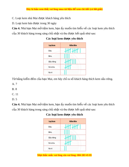 ủ 30 khách hàng trong sáng chủ nh t ậ và thu đư c ợ k t ế qu nh ả ư sau: Các loại kem đư c ợ yêu thích T b ừ ng ki ả m ể đ m ế c a b ủ n ạ Mai, em hãy ch r ỉ a s khách ố hàng thích kem s u r ầ iêng. A. 7 B. 8 C. 11 D. 5 Câu 4. Nhà b n M ạ ai m t ở i m ệ kem, b n ạ y m ấ u n t ố ìm hi u v ể các ề lo i ạ kem yêu thích c a
