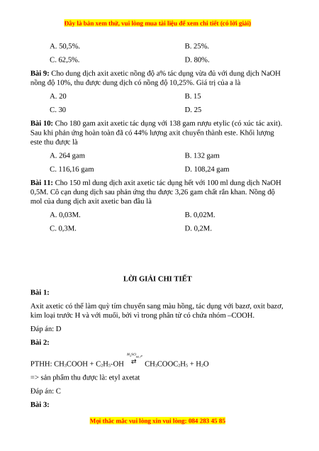 Bài 9: Cho dung dịch axit axetic nồng độ a% tác dụng vừa đủ với dung dịch NaOH