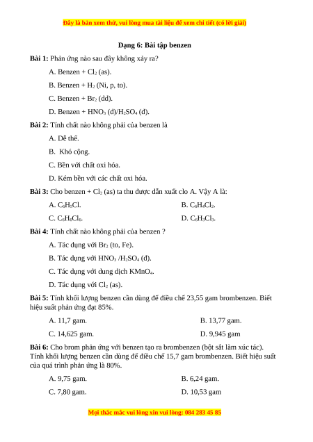 Vì hiệu suất chỉ đạt 85% => khối lượng benzen cần dùng là: mbenzen = Đáp án: B Bài 6: Phương trình hóa học: 0,1 ← 0,1 (mol) Đáp án: A Bài 7: Phương trình hóa học: 0,2 → 1,2 → 0,6 (mol) 1,2 → 1,2 (mol)