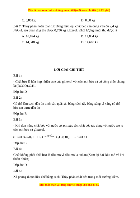 Bài 7: Thủy phân hoàn toàn 17,16 kg một loại chất béo cần dùng vừa đủ 2,4 kg