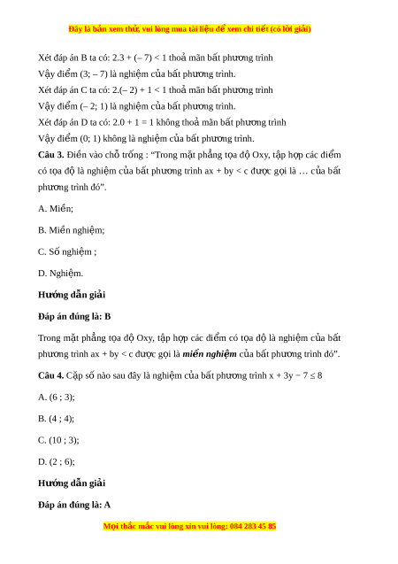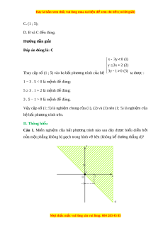 ơ trình ax + by < c đư c ợ g i ọ là … c a ủ b t ấ phư ng ơ trình đó”. A. Mi n; ề B. Mi n nghi ề m ệ ; C. Số nghi m ệ ; D. Nghi m ệ . Hư ng d ớ ẫn gi i ả Đáp án đúng là: B Trong m t ặ ph ng ẳ t a ọ độ Oxy, t p ậ h p ợ các đi m ể có t a ọ đ ộ là nghi m ệ c a ủ b t ấ phư ng