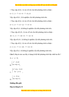 Câu 1. Đáp án nào sau đây có d ng ạ là b t ấ phư ng t ơ rình b c nh ậ t ấ hai n ? ẩ A. 2x2 + 2x < −4; B. x + y = 2; C. 2x – 5y3 > 0 ; D. 3x + 2y ≤ 1 Hư ng ớ d n gi ẫ i ả Đáp án đúng là: D Vì b t ấ phư ng ơ trình b c ậ nh t ấ hai n ẩ có d ng