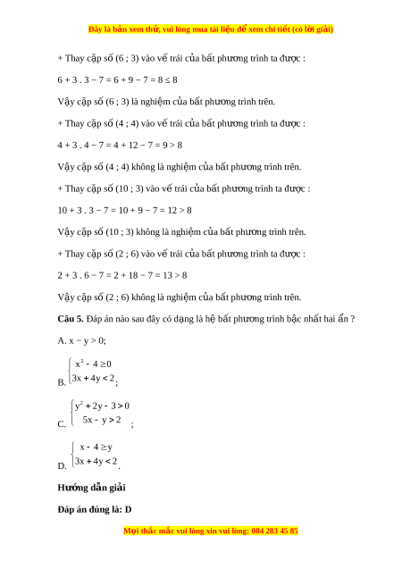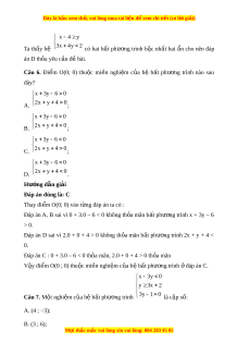 Đây là bản xem th , vu ử i lòng mua tài li u ệ đ xe ể m chi ti t (c ế ó l i ờ gi i ả ) x 4 y Ta th y ấ hệ 3x 4y 2 có hai b t ấ phư ng ơ trình b c ậ nh t ấ hai n ẩ cho nên đáp án D th a ỏ yêu c u đ ầ bài ề . Câu 6. Đi m ể O(0; 0) thu c ộ mi n ề nghi m ệ c a ủ hệ b t ấ phư ng ơ trình nào sau đây? x 3y 6 0 A. 2x y 4 0 ; x 3y 6 0 B. 2x y 4 0 ; x 3y 6 0 C. 2x y 4 0 ; x 3y 6 0 D. 2x y 4 0 . Hư ng d ớ ẫn giải Đáp án đúng là: C Thay đi m ể O(0; 0) vào t ng đáp ừ án ta có :