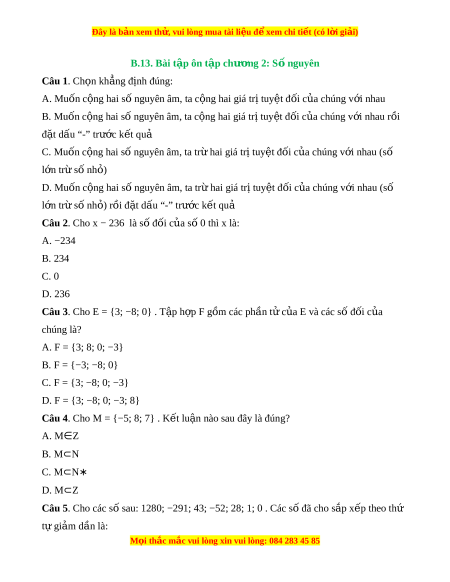 Đây là bản xem th , vu ử i lòng mua tài li u ệ đ xe ể m chi ti t (c ế ó l i ờ gi i ả ) B.13. Bài t p ôn t ậ p ch ậ ư ng 2: ơ S nguyên ố Câu 1. Ch n ọ kh ng đ ẳ nh đúng: ị A. Muốn c ng