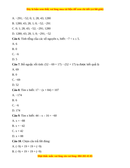 ặ rồi tính: (52 – 69 + 17) − (52 + 17) ta đư c k ợ t ế qu l ả à A. 69 B. 0 C. −69 D. 52 Câu 8. Tìm x bi t ế : 17 − (x + 84) = 107 A. −174 B. 6 C. −6 D. 174 Câu 9. Tìm x bi t ế : 44 – x – 16 = −60 A. x = −88 B. x = −42 C. x = 42 D. x = 88 Câu 10. Ch n ọ câu tr l ả i ờ đúng: A. (−9) + 19 = 19 + (−9)