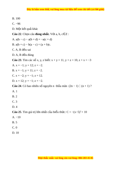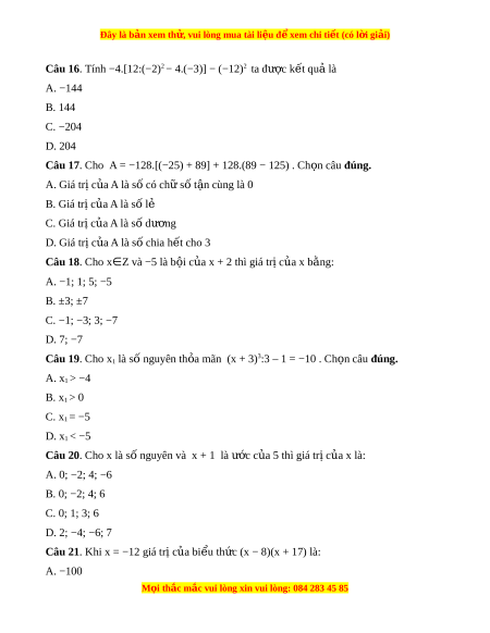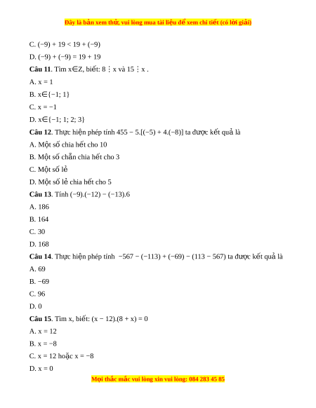 ự hiện phép tính −567 − (−113) + (−69) − (113 − 567) ta đư c k ợ t ế qu l ả à A. 69 B. −69 C. 96 D. 0 Câu 15. Tìm x, bi t ế : (x − 12).(8 + x) = 0 A. x = 12 B. x = −8 C. x = 12 ho c ặ x = −8 D. x = 0 M i ọ thắc m c