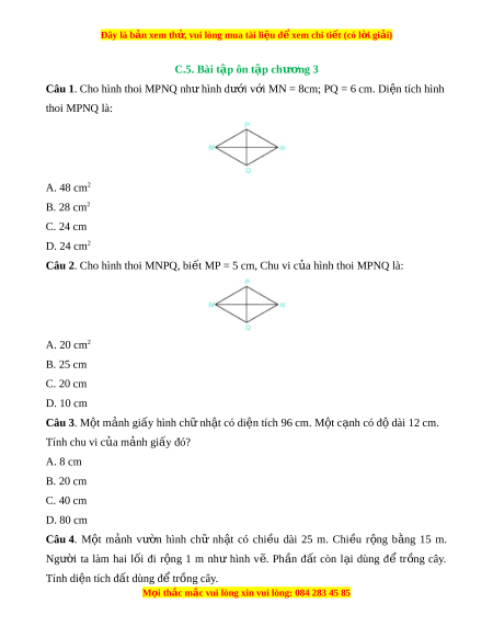 Câu 2. Cho hình thoi MNPQ, bi t ế MP = 5 cm, Chu vi c a ủ hình thoi MPNQ là: A. 20 cm2 B. 25 cm C. 20 cm D. 10 cm Câu 3. M t ộ m nh gi ả ấy hình ch nh ữ t ậ có di n t ệ ích 96 cm. M t ộ c nh có đ ạ dài ộ 12 cm. Tính chu vi c a m ủ nh ả gi y đó? ấ A. 8 cm B. 20 cm C. 40 cm D. 80 cm Câu 4. M t ộ m nh ả vư n ờ hình chữ nh t ậ có chi u ề dài 25 m. Chi u ề r ng ộ b ng ằ 15 m. Ngư i ờ ta làm hai l i ố đi r ng ộ 1 m như hình v . ẽ Ph n ầ đ t ấ còn l i ạ dùng để tr ng ồ cây. Tính di n t ệ ích đ t ấ dùng đ t ể r ng cây ồ . M i ọ thắc m c