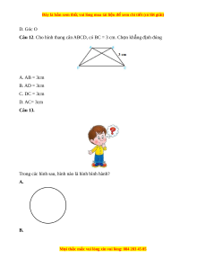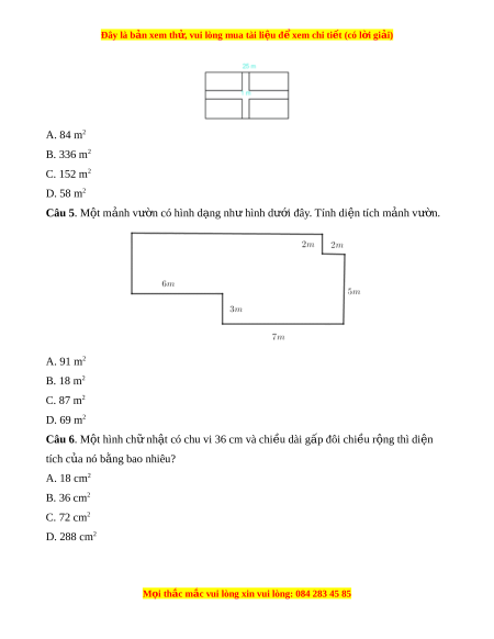 Đây là bản xem th , vu ử i lòng mua tài li u ệ đ xe ể m chi ti t (c ế ó l i ờ gi i ả ) A. 84 m2 B. 336 m2 C. 152 m2 D. 58 m2 Câu 5. M t ộ m nh v ả ư n ờ có hình d ng nh ạ ư hình dư i ớ đây. Tính di n t ệ ích m nh v ả ư n. ờ A. 91 m2 B. 18 m2 C. 87 m2 D. 69 m2 Câu 6. M t ộ hình ch nh ữ t