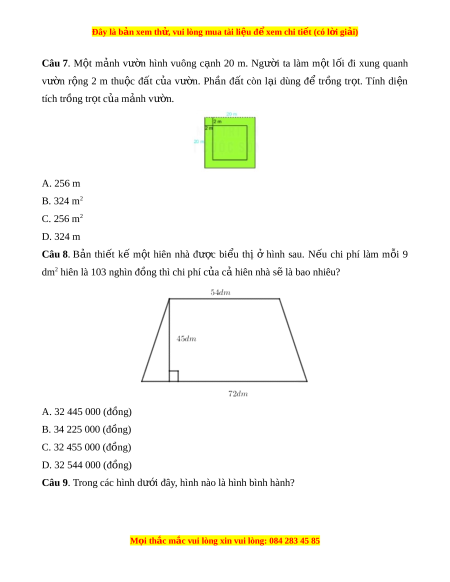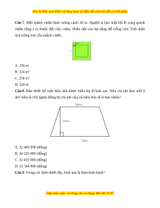 Đây là bản xem th , vu ử i lòng mua tài li u ệ đ xe ể m chi ti t (c ế ó l i ờ gi i ả ) Câu 7. M t ộ m nh ả vư n ờ hình vuông c nh ạ 20 m. Ngư i ờ ta làm m t ộ l i ố đi xung quanh vư n ờ r ng ộ 2 m thu c ộ đ t ấ c a ủ vư n. ờ Ph n ầ đ t ấ còn l i ạ dùng để tr ng ồ tr t ọ . Tính di n ệ tích trồng tr t ọ c a ủ m nh v ả ư n. ờ A. 256 m B. 324 m2 C. 256 m2 D. 324 m Câu 8. B n ả thi t ế kế m t ộ hiên nhà đư c ợ bi u ể thị ở hình sau. N u ế chi phí làm m i ỗ 9