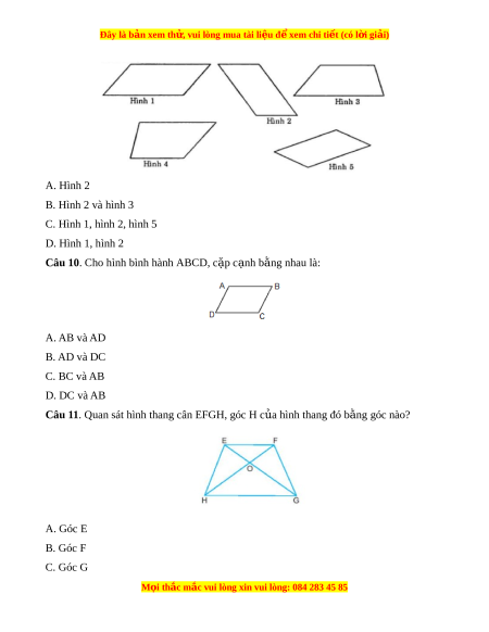 Câu 11. Quan sát hình thang cân EFGH, góc H c a hì ủ nh thang đó b ng ằ góc nào? A. Góc E B. Góc F C. Góc G M i ọ thắc m c