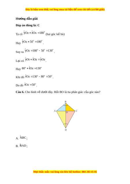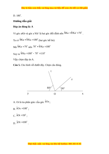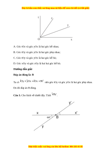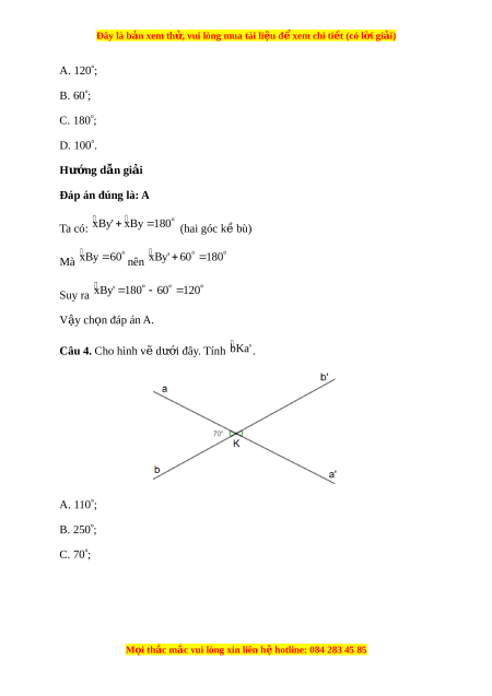 Đây là bản xem th , vu ử i lòng mua tài li u ệ đ xe ể m chi ti t ế (có l i ờ gi i ả ) A. 120; B. 60; C. 180; D. 100. Hư ng d ớ ẫn gi i ả Đáp án đúng là: A Ta có: xBy' xBy 180 (hai góc k bù ề ) Mà xBy 60 nên xBy' 60 180 Suy ra xBy' 180 60 12 0 V y ậ ch n đáp án ọ A. Câu 4. Cho hình v d ẽ ư i ớ đây. Tính bKa' . A. 110; B. 250; C. 70; M i ọ thắc m c