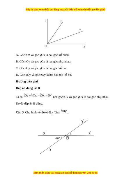 D. Góc xOy và góc zOy là hai hai góc k bù. ề Hư ng d ớ ẫn gi i ả Đáp án đúng là: B Ta có tOy yOx t Ox 90