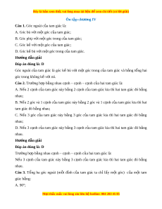 ủ tam giác là góc kề bù v i ớ m t ộ góc trong c a ủ tam giác và b ng ằ t ng ổ hai góc trong không k v ề i ớ nó. Câu 2. Trư ng h ờ p b ợ ng ằ nhau c nh – c ạ nh – c ạ nh ạ c a hai ủ tam giác là: A. N u ế 2 c nh c ạ a ủ tam giác này b ng ằ 2 c nh c ạ a