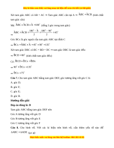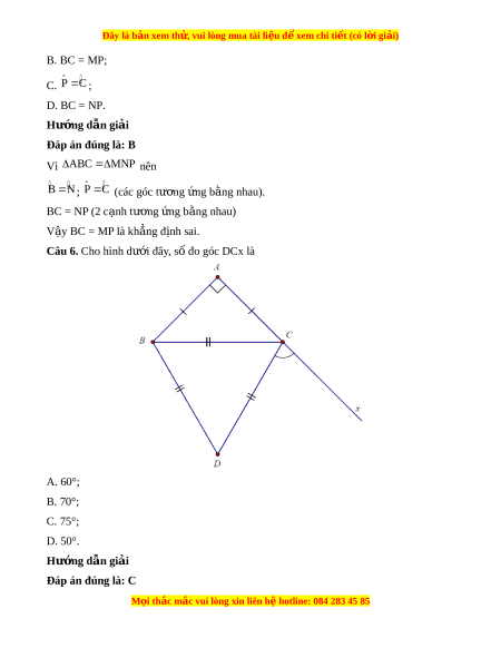 Đây là bản xem th , vu ử i lòng mua tài li u ệ đ xe ể m chi ti t (c ế ó l i ờ gi i ả ) B. BC = MP; C. P C ; D. BC = NP. Hư ng d ớ ẫn gi i ả Đáp án đúng là: B Vì A BC M NP nên B N ; P C (các góc tư ng ơ ng b ứ ng ằ nhau). BC = NP (2 c nh t ạ ư ng ơ ng ứ b ng nhau) ằ V y ậ BC = MP là kh ng đ ẳ nh s ị ai. Câu 6. Cho hình dư i