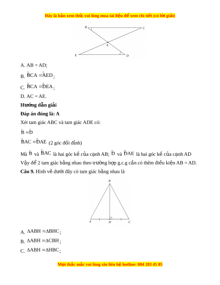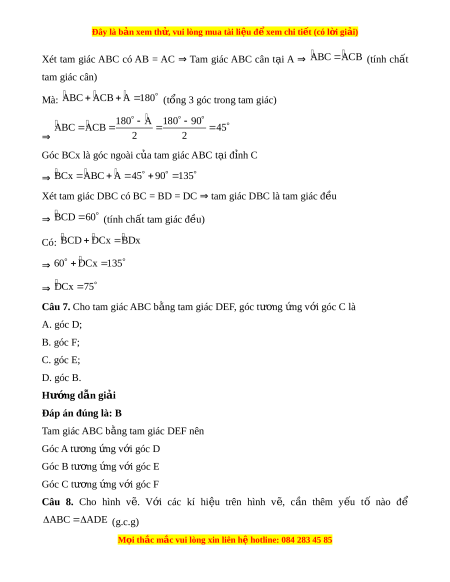 Câu 7. Cho tam giác ABC b ng ằ tam giác DEF, góc tư ng ơ ng v ứ i ớ góc C là A. góc D; B. góc F; C. góc E; D. góc B. Hư ng d ớ ẫn gi i ả Đáp án đúng là: B Tam giác ABC b ng t ằ am giác DEF nên Góc A tư ng ơ ng v ứ i ớ góc D Góc B tư ng ơ ng v ứ i ớ góc E Góc C tư ng ơ ng v ứ i ớ góc F Câu 8. Cho hình v . ẽ V i ớ các kí hi u ệ trên hình v , ẽ c n ầ thêm y u ế tố nào để ABC A DE (g.c.g) M i