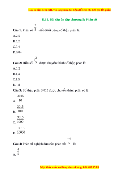 Đây là bản xem th , vu ử i lòng mua tài li u ệ đ xe ể m chi ti t (c ế ó l i ờ gi i ả ) E .12. B ài t p ôn t ậ p ch ậ ư ng 5: ơ Phân số 2