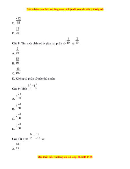 Đây là bản xem th , vu ử i lòng mua tài li u ệ đ xe ể m chi ti t (c ế ó l i ờ gi i ả ) 12 C. 35 12 D. 35 1 2 Câu 8: Tìm m t ộ phân số gi ở a hai ữ phân số 10 và 10 . 3 A. 10 15 B. 10 15 C. 100